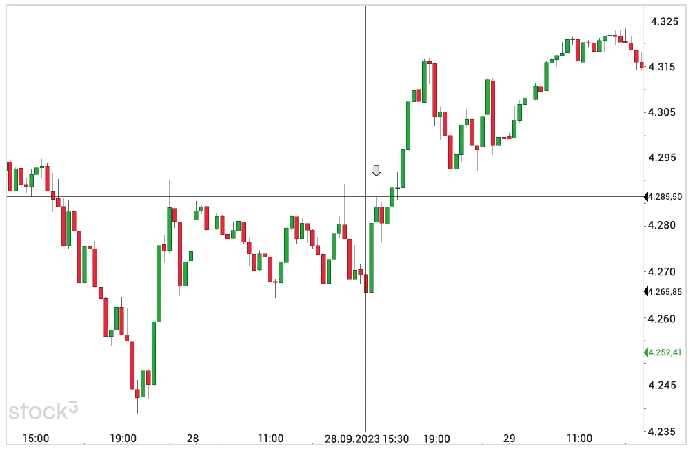 La fase di apertura inizia alle 15:30 e nei primi 15 minuti si formano un massimo e un minimo. Se il mercato supera il massimo, viene aperta una posizione long. Se il mercato scende sotto il minimo, viene aperta una posizione short.
