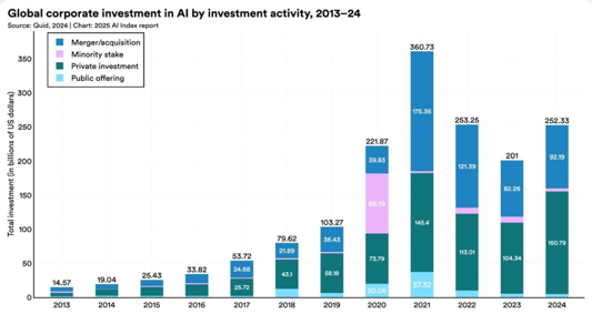 In particolate, nei tre anni successivi al lancio di ChatGPT, ovvero dal 2022 al 2024, complessivamente sono stati investiti oltre 700 miliardi di dollari, 175 dei quali in attività di M&A (+12,1% sul 23):