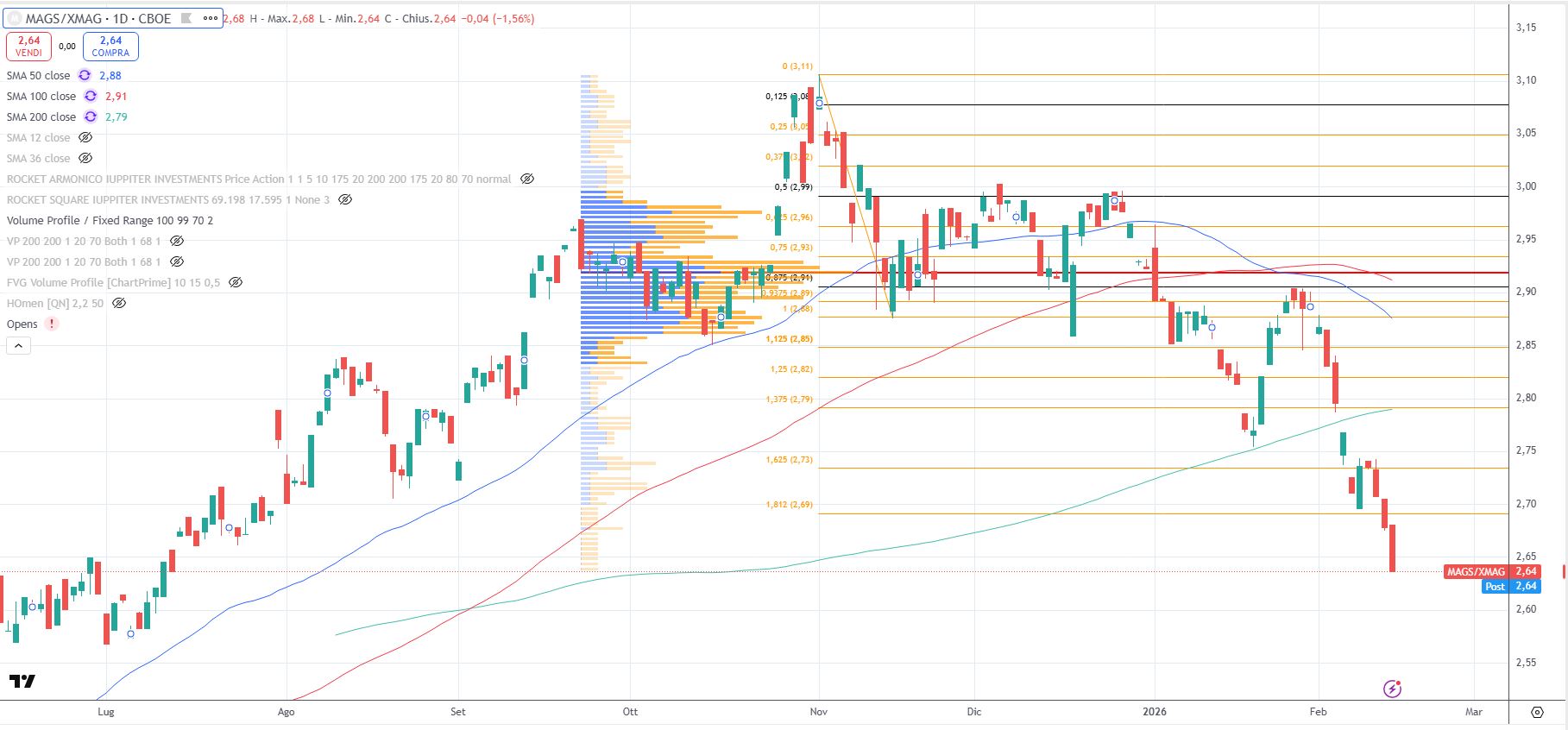 Il grafico mostra l’S&P 7 contro l’S&P 493: il tuffo delle Magnifiche verso gli abissi è evidente.
