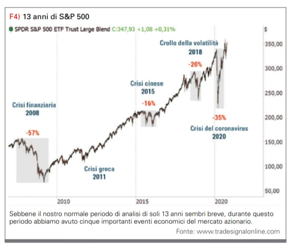 Il professore di finanza statunitense Robert Haugen dell’Università dell’Illinois ha scoperto il paradosso del rischio negli anni ’70. Molti altri studi e articoli hanno confermato questa anomalia nel mercato azionario. Analizzando i nostri portafogli, siamo stati in grado di confermare questo risultato: i titoli che non ci hanno mai preoccupato hanno anche generato rendimenti migliori nel lungo termine. È stato il contrario con i candidati delle montagne russe: abbiamo vissuto molti alti e bassi ed effettivamente non c’era molto ritorno anche dopo un lungo periodo di attesa. Per questo motivo, rendimento e rischio devono essere sempre considerati in un’analisi. Un grafico rischio-rendimento è quindi adatto per analizzare i singoli titoli. Le azioni sono classificate in base al rischio e al rendimento e quindi fissate in relazione al benchmark. Nella maggior parte dei casi, questo benchmark è l’S&P 500. La figura 3 mostra le diverse aree in cui possono essere suddivise le azioni. Gli investitori trovano le azioni con una performance migliore al di sopra del benchmark e azioni con un rendimento inferiore al di sotto di esso. Le azioni più volatili si trovano sul lato destro del grafico, mentre le società a bassa volatilità sono sul lato sinistro. Le azioni migliori sono Fonte che offrono rendimenti più elevati con una volatilità inferiore. Le peggiori, invece, fluttuano più fortemente (sono quindi più rischiosi) e hanno una performance inferiore. È anche importante per noi in questa analisi che vengano presi in considerazione diversi periodi di tempo. In primo luogo, guardiamo sempre a un periodo di tempo più lungo, seguito da due fasi di crisi. Per l’analisi a più lungo termine, di solito utilizziamo gli anni dal 2007 al 2020. Periodi più lunghi non sono ottimali, poiché la bolla delle dot-com, ad esempio, distorce l’immagine dei titoli tecnologici negli anni 2000. Sebbene questo periodo di prova duri solo 13 anni, durante questo periodo abbiamo avuto il mercato rialzista più forte nella storia del dopoguerra e la più ampia gamma di scenari che possiamo immaginare (vedi figura 4).