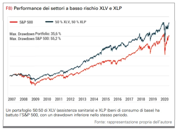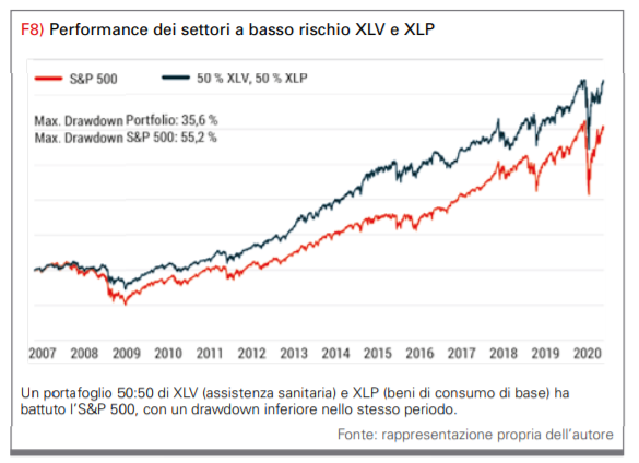 Diamo uno sguardo alla figura 10. Il produttore statunitense di beni di consumo Procter & Gamble è noto per marchi come Ariel e Pampers. Questi beni sono richiesti anche in una crisi, quindi l’andamento dei prezzi a lungo termine sembra molto solido. Naturalmente, i corsi sono corretti anche per tali società. Il calo maggiore nella crisi finanziaria del 2009 è stato di circa il 40%, mentre l’S&P 500 ha corretto il 55%. La crisi del coronavirus ha lasciato il segno anche su Procter & Gamble. Il prezzo ha perso circa il 25%, ma l’S&P 500 ha perso circa il 35% nello stesso periodo. Nessun trader e investitore serio può evitare completamente i drawdown, e soprattutto nel caso della crisi finanziaria, società solide come Procter & Gamble hanno sofferto, ma in maniera significativamente inferiore rispetto all’indice di riferimento o persino alle azioni del settore finanziario o energetico. Questa stabilità dovrebbe farti dormire molto più rilassato come investitore ed è anche più redditizia.