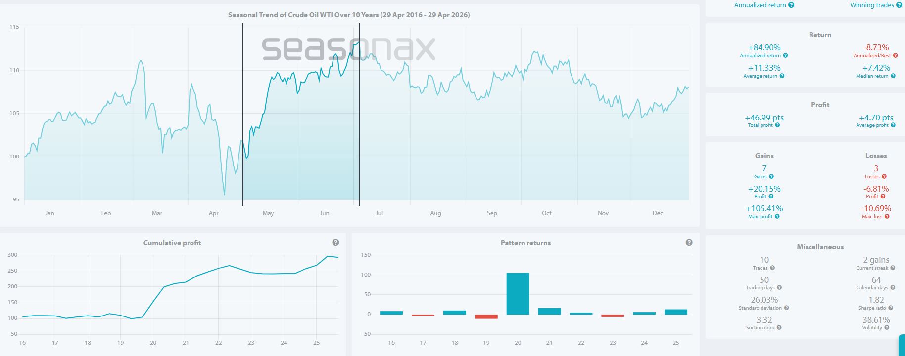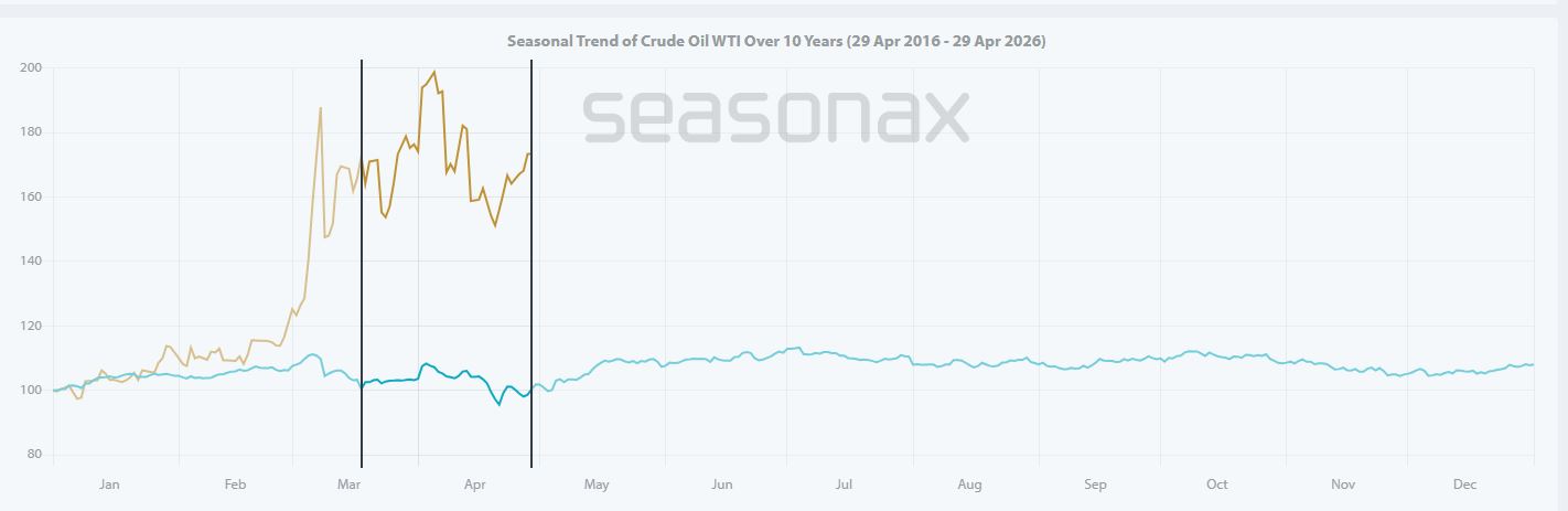 Eppure, finora, il petrolio nel 2026 ha rispettato le principali date di massimi e minimi tipiche della stagionalità a 10 anni: come spesso accade il timing è simile ma la magnitudine differente.