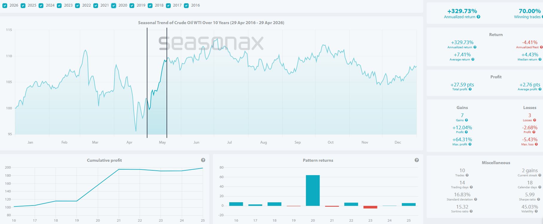 Stagionalità a 10 anni del petrolio, periodo 1-21 maggio