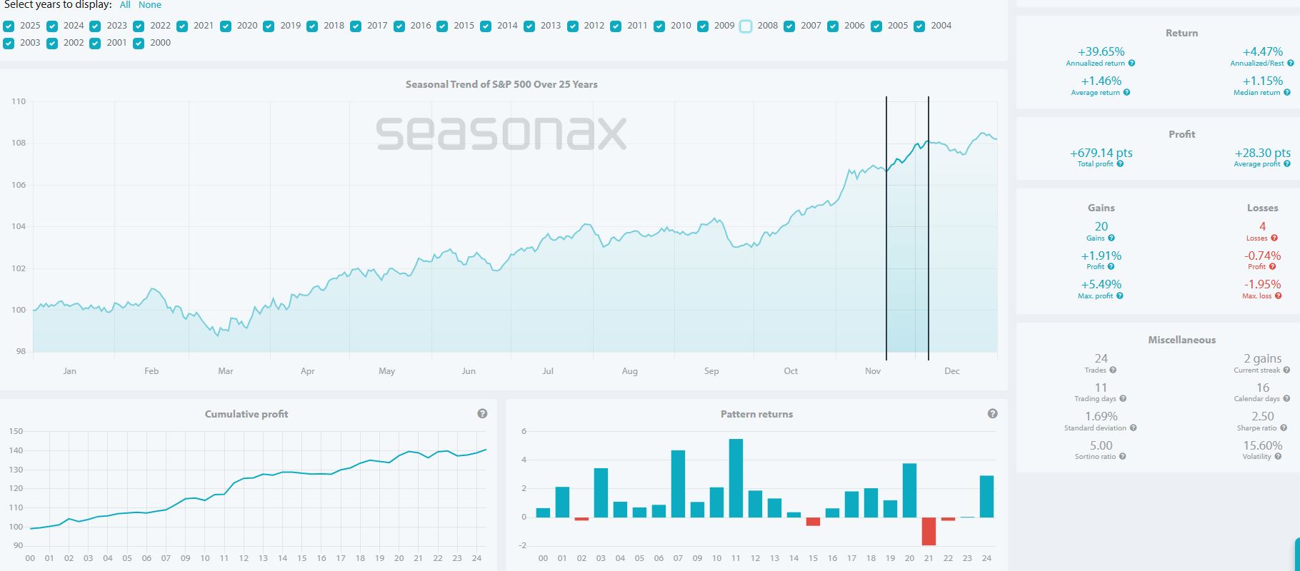 Il giorno 20 novembre è un minimo statistico importante, in tale analisi basata sui parametri stagionali di cui sopra: i lettori più attenti ricorderanno che coincideva anche con la zona temporale del minimo precedente alla settimana del Thanksgiving (17-24 novembre).