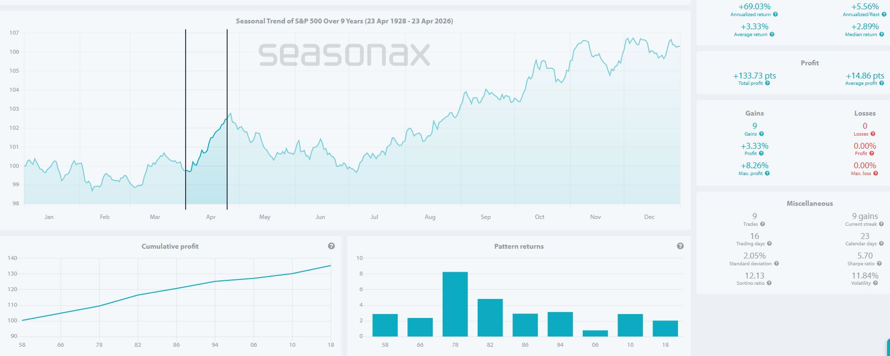 Con un rialzo medio del 3.3% e un massimo rialzo dell’8.26% (avvenuto nel 1978) rappresentano bene la positività stagionale del mese di aprile.