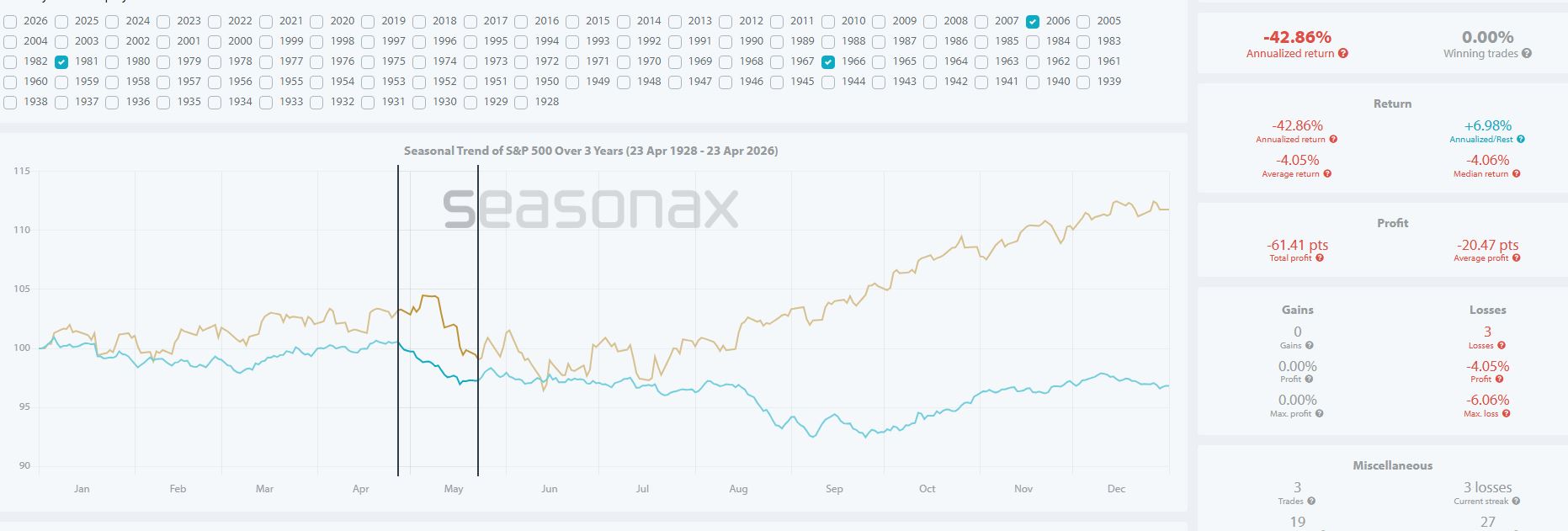 Sei anni su nove hanno avuto un ribasso superiore al 3%, un settimo anno superiore al 2%. Due anni rimanenti non hanno di fatto avuto ribasso nel periodo (1958 e 1978).