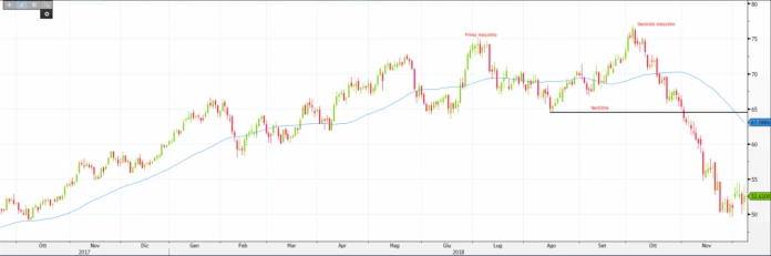 Sul grafico giornaliero del petrolio WTI, la configurazione è piuttosto precisa e ha fatto seguito ad un movimento rialzista molto intenso. La conferma della figura, avvenuta con il breakout della neckline, ha portato velocemente ad un sell-off della materia prima.
