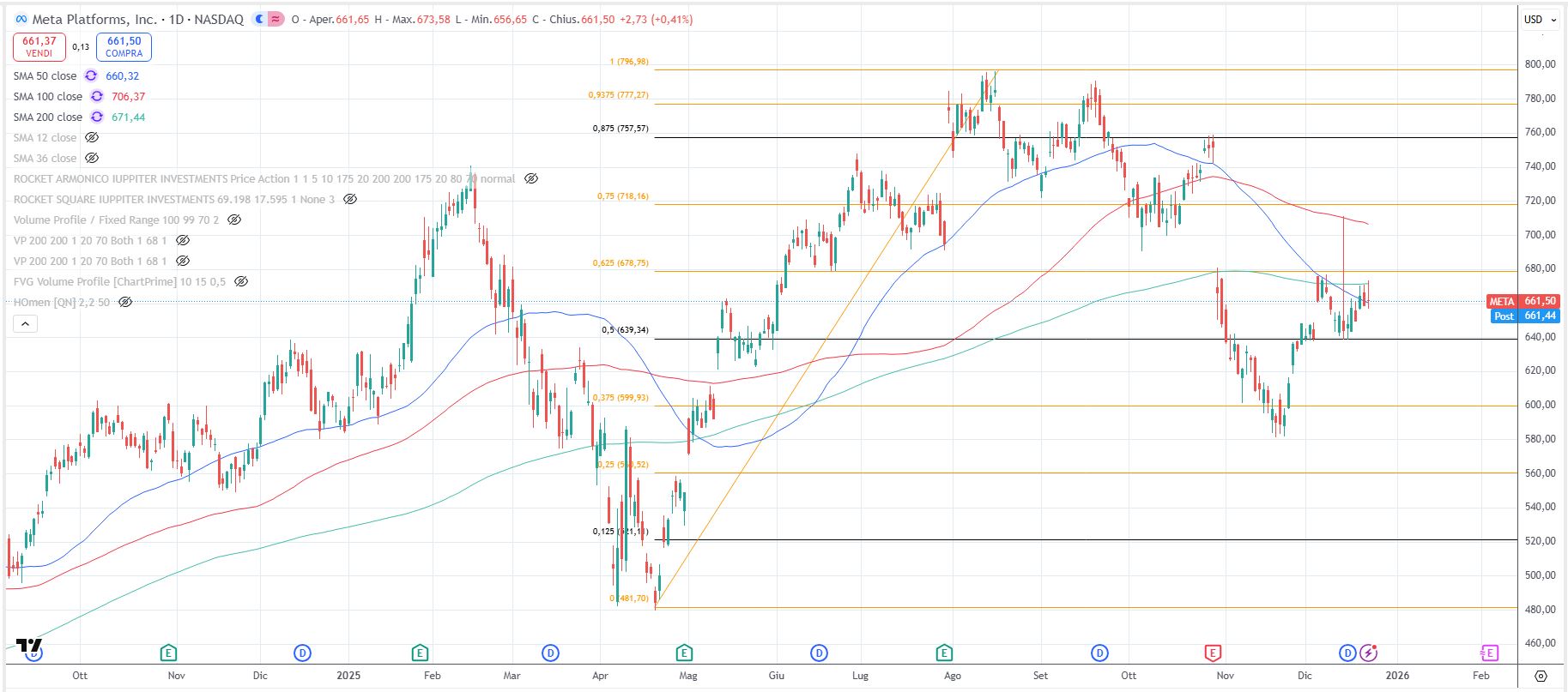 Dopo il minimo del 21 novembre, comune a molti titoli sulla borsa americana, Meta è rimbalzata sulla linea del 50% dell’ultimo range.